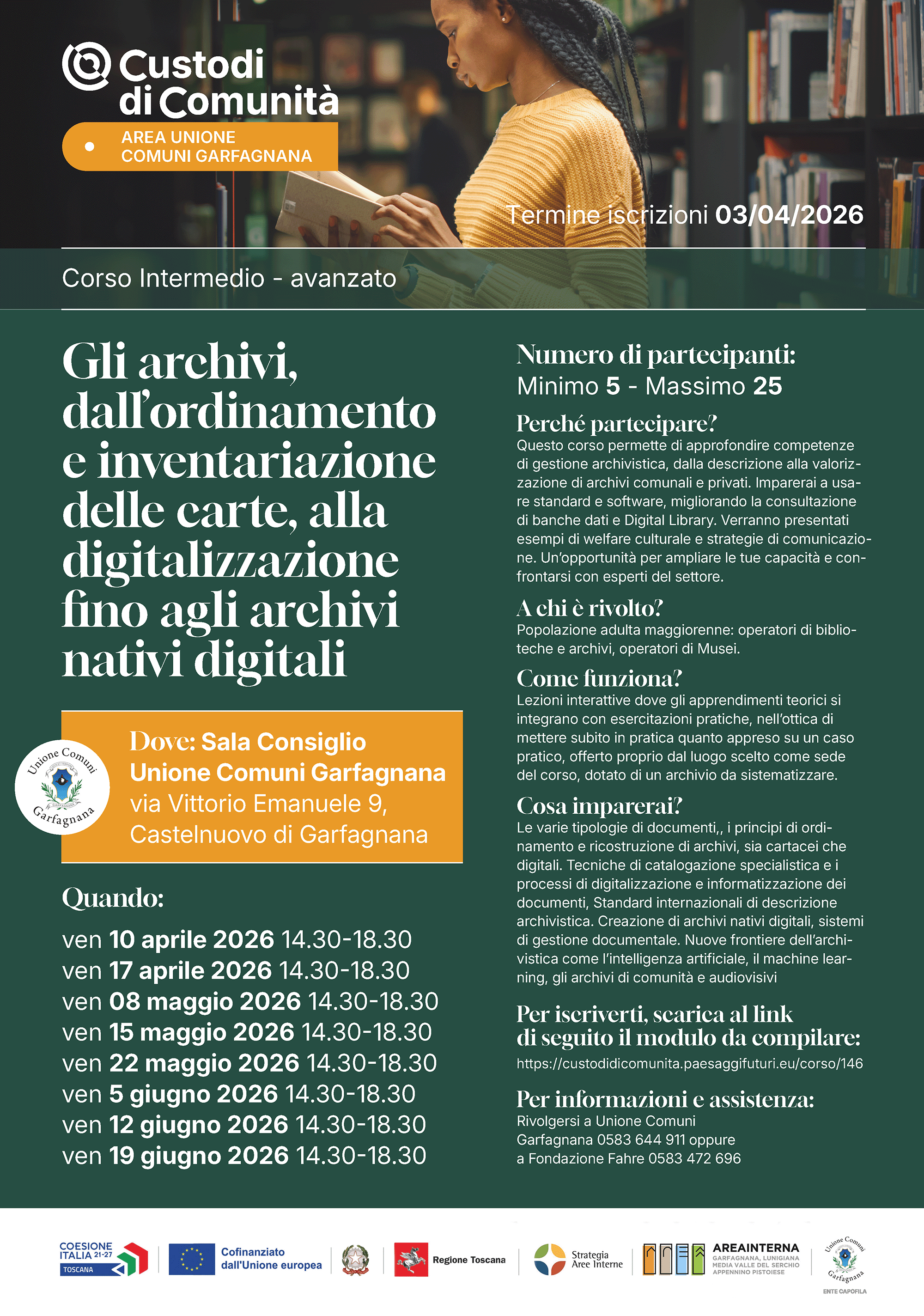 Le lezioni si svolgeranno presso la Sala Consiglio dell’Unione Comuni Garfagnana, in via Vittorio Emanuele 9 a Castelnuovo di Garfagnana, a partire da venerdì 10 aprile 2026, con incontri pomeridiani dalle 14.30 alle 18.30. Il corso è rivolto alla popolazione adulta maggiorenne, in particolare a operatori di biblioteche, archivi e musei.